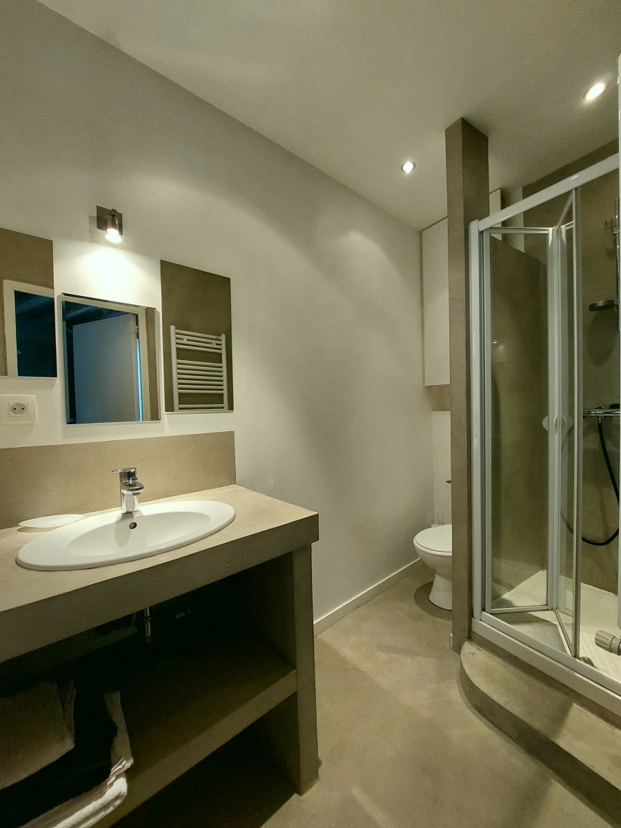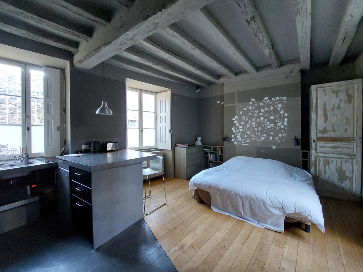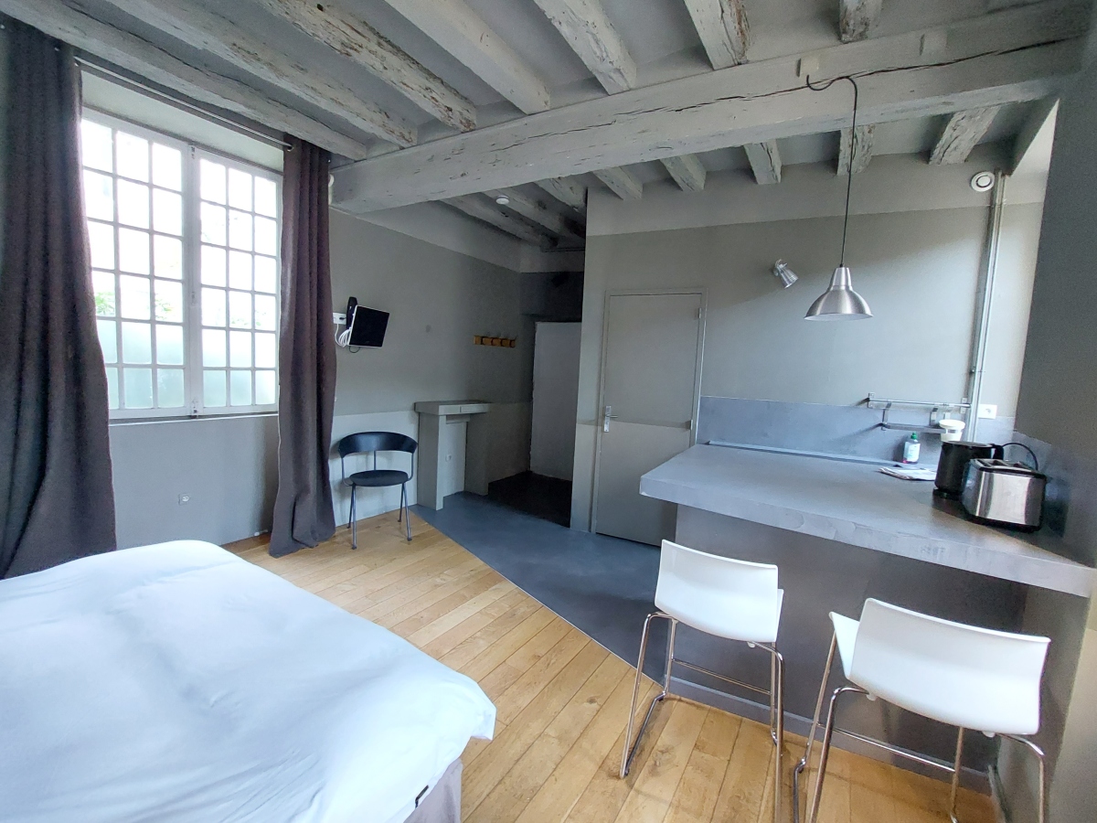 Studio de charme de 29m² au rez-de-chaussée, confortable et calme, ouvrant d’une part sur la cour pavée et fleurie (l’été), d’autre part sur la rue piétonne. Les poutres apparentes et la présence de matériaux nobles, contribuent au charme et à l’atmosphère de cet espace accueillant.